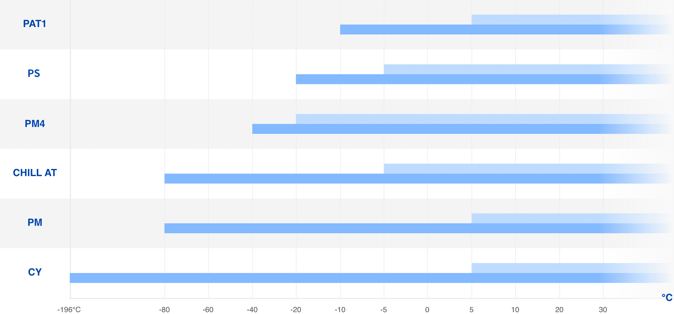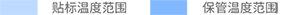 琳得科鉴于食品以及药品的保管环境,定义常温(30~15℃)、冷蔵(15~5℃)、微冻(5~-5℃)、冷冻(-5~-80℃)、极低温(-196℃)。 贴标温度范围…标签可以粘贴的温度范围。 保管温度范围…标签可以维持粘着力的温度范围。 有可能与JIS(日本产业标准)和厚生劳动省等制定的温度范围有差异。图表的贴标・保管温度范围只做参考,并非产品性能和品质的保证值。事先敬请做好充分的测试!